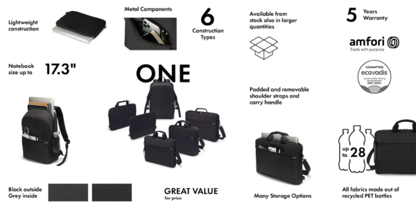 Keep essentials organized and accessible with this DICOTA ONE carry solution. Its front zip pocket provides easy access to your smartphone, cards, and pens. Transport is effortless thanks to a length-adjustable, removable shoulder strap and comfortable handle. The ONE series emphasizes durability with an extended five-year guarantee and is sustainably crafted using recycled PET main material, demonstrating DICOTA’s commitment to quality and the environment.