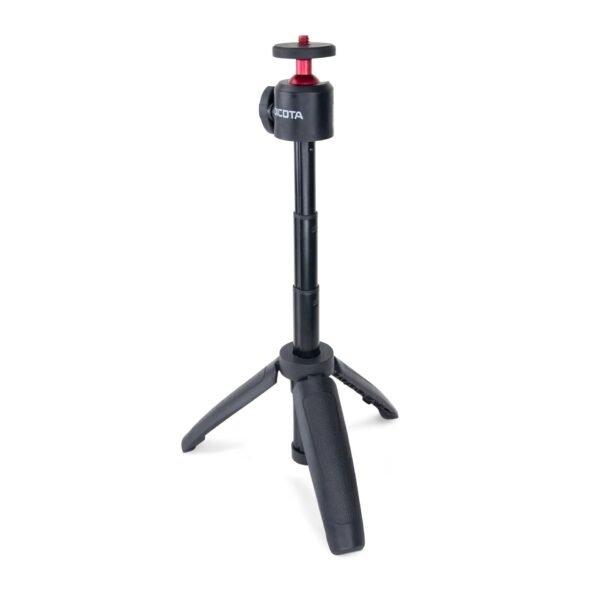 The Webcam Tripod Stand is 147mm in height when fully collapsed. When set up this way, it can be used as a desktop tripod or a short handgrip. It’s designed with a center column that extends out, bringing the maximum height to 245mm. It offers durability and flexibility thanks to an integrated tilt and swivel ball head.